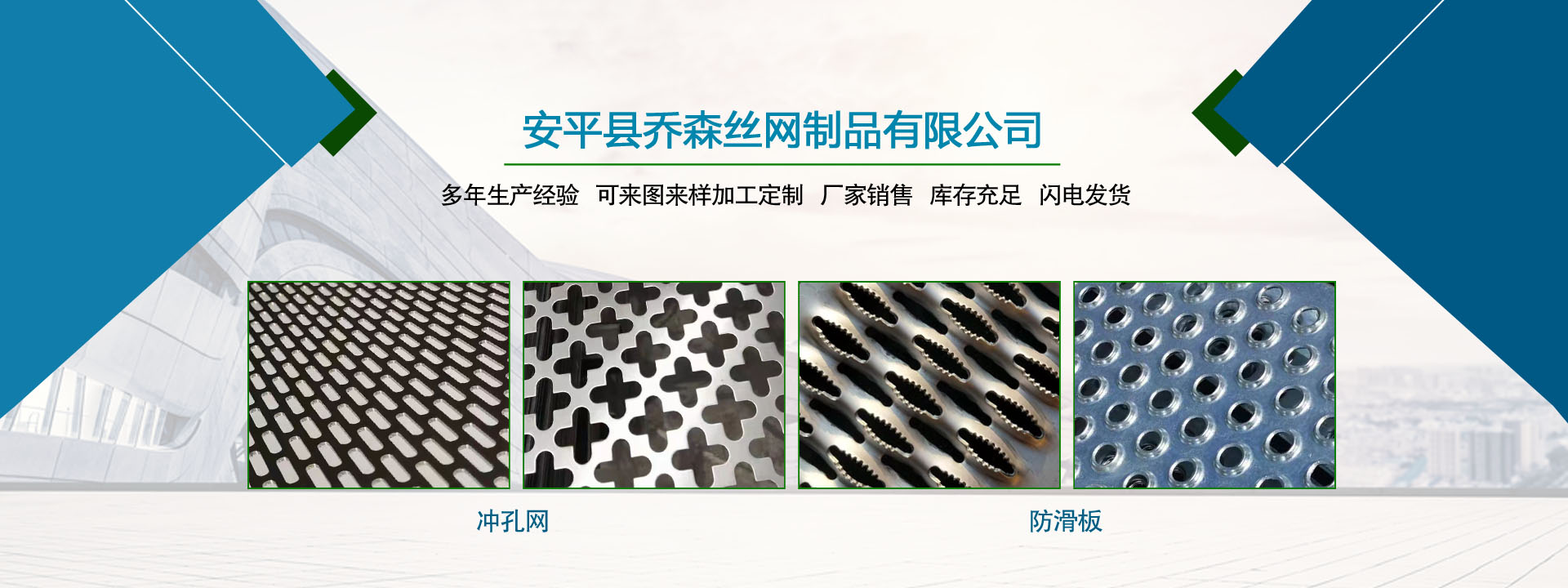 安平縣喬森絲網(wǎng)制品有限公司主營產(chǎn)品:篩網(wǎng)、金屬裝飾網(wǎng)、沖孔網(wǎng)板、防滑板和軋花網(wǎng)。常年現(xiàn)貨供應45號黑鋼絲編織篩網(wǎng)、熱鍍鋅鋼絲篩網(wǎng)、304不銹鋼篩網(wǎng)和冷鍍鋅鐵絲網(wǎng),加工定做耐磨65號錳鋼絲篩網(wǎng)、菱形孔防堵篩網(wǎng)、養(yǎng)殖用長方孔鐵絲網(wǎng)、金屬裝飾網(wǎng)、盤條